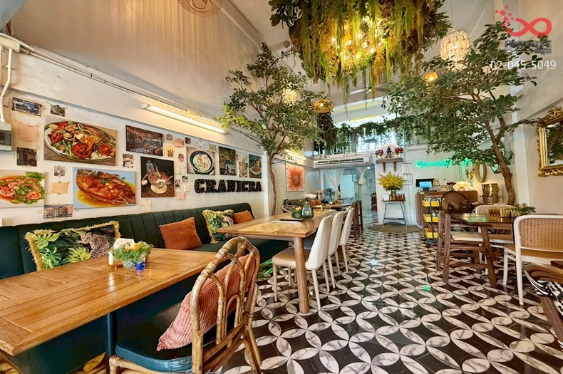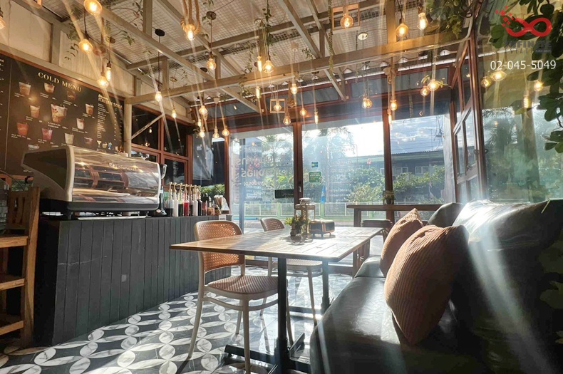 ตกแต่ง : ร้านอาหารสไตล์สวน เครื่องชงกาแฟ/เครื่องPOS/ตู้เย็น/ตู้แช่/ปั๊ม แท๊งน้ำ/โต๊ะ–เก้าอี้(12ชุด)/โซฟา/เคาน์เตอร์ครัว ต่อเติมห้องกระจก