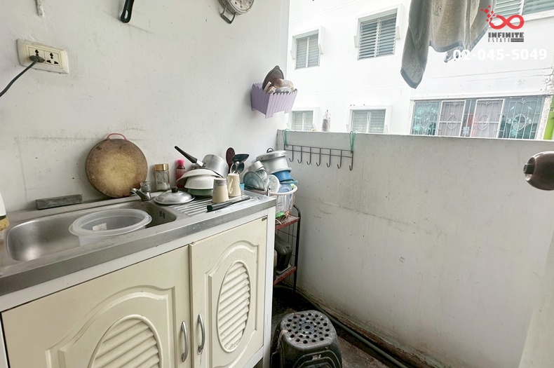 มีเคาน์เตอร์ครัว และระเบียงหลังห้องติดเหล็กดัดเรียบร้อย โปร่ง ลมเข้าได้ดี อยู่สบาย